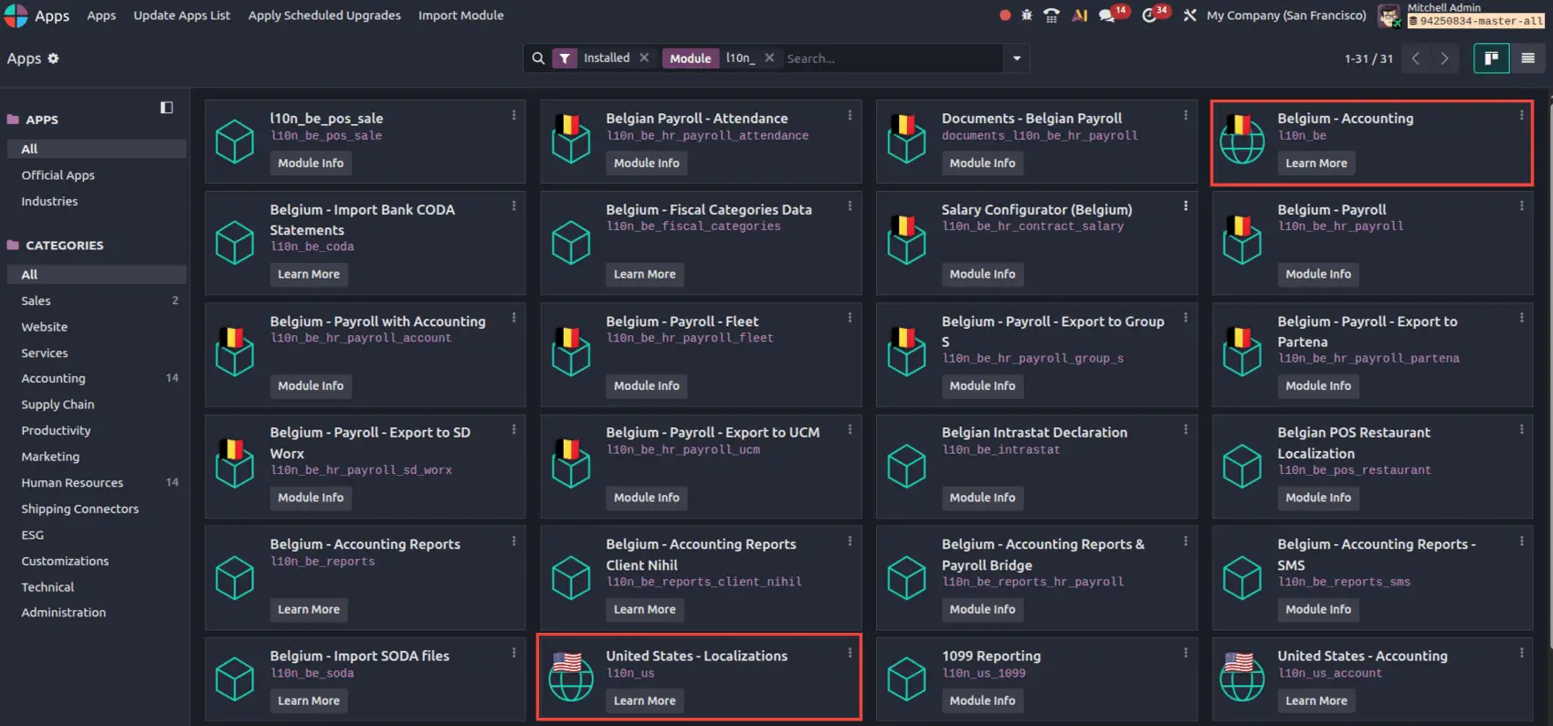 Each localization pack provides ready-to-use charts of accounts, taxes, document templates, and compliance reports.