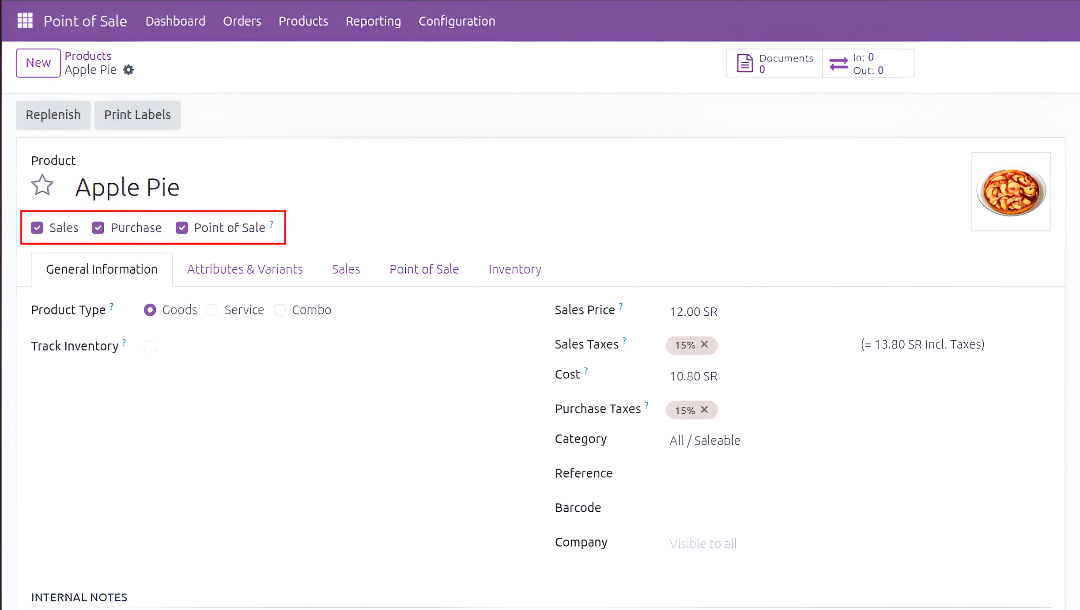 First, you need to open the Products menu in the POS module. And click on the New button, after entering all basic details including name, sales price, product type and all, you need to make sure that the checkboxes named Sale and Point of Sales, under product name, are checked.