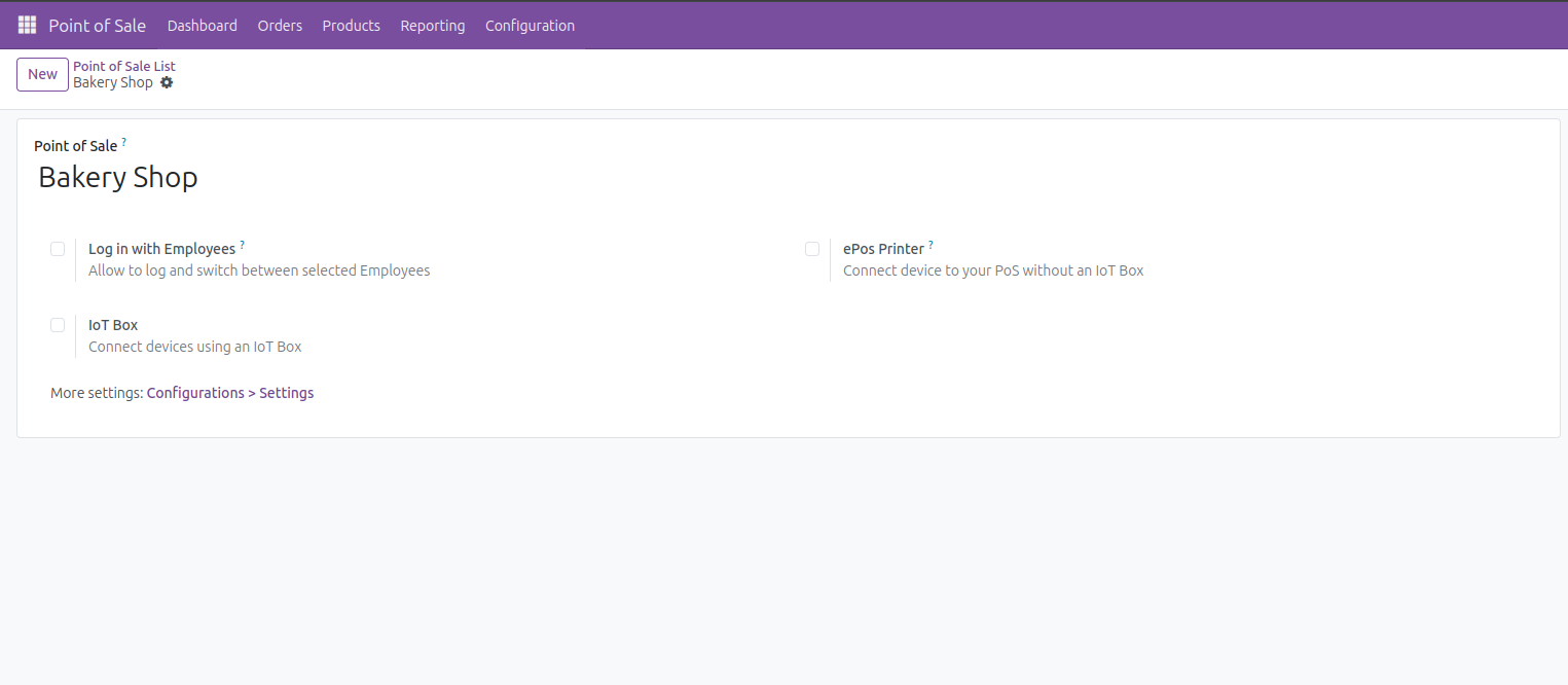 Now let's see how to create a point-of-sale shop. For this head towards the configuration menu and under this menu you will find another menu named Point of Sales. Click on this and create a new shop by adding a name. For all the remaining settings, head towards the Configuration > Setting directly from the Point of Sales form.