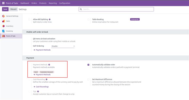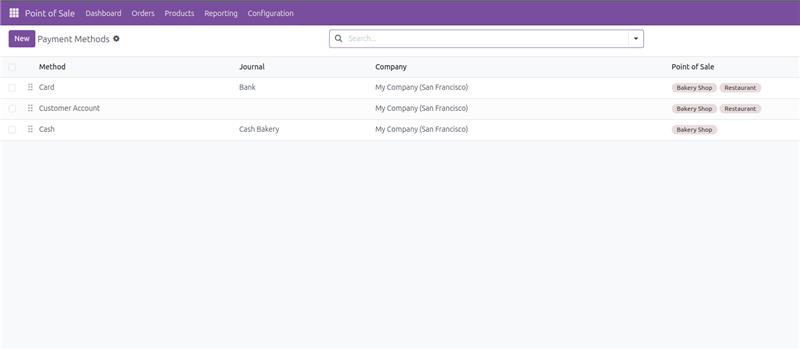Now we need to configure payment methods for this store. Odoo point of sale can manage multiple payment methods in a single POS order. For this go to the Configuration > Payment Methods. Now you can create any of the available payment methods in your store. For example, let’s say I have a card, cash and a customer account, and I have created all these methods here with corresponding journals.