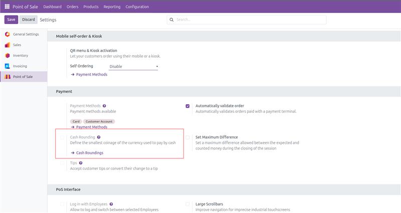 Odoo point of sale allows to configure to apply cash rounding to the total amount of the bill. For this enable cash rounding in POS settings and redirect to its form. You need to add the profit and loss accounts to create a new rounding. You can also choose rounding methods like Up, Down, and Nearest for your rounding.