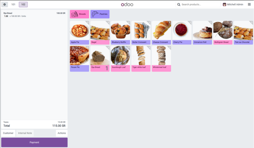 Now let's check what happens if we set tax excluded from the settings. See the price shows as 100 SR and total as 115 SR with tax of 15. This will be also reflected in the order receipt. This is how you can use these settings to manage B2B and B2C environments in your Odoo Point of Sales.