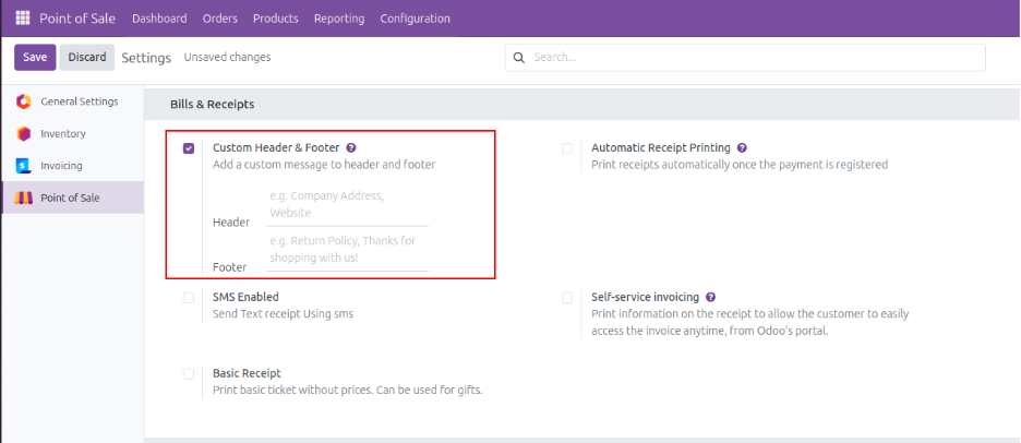 Users can easily add their custom header and footer to their receipt from the settings itself. For this you need to enable the option under Bills and Receipts from the settings and fill out the data to be printed on your receipt for both header and Footer.