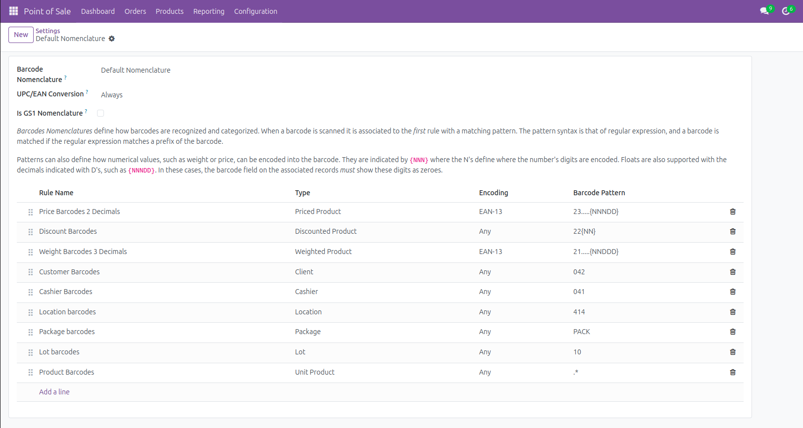 You can use barcodes for scanning products, customer cards etc. in your Odoo Point of Sale for an easier business workflow. For this you just need to set a Barcode Nomenclature in your POS settings.